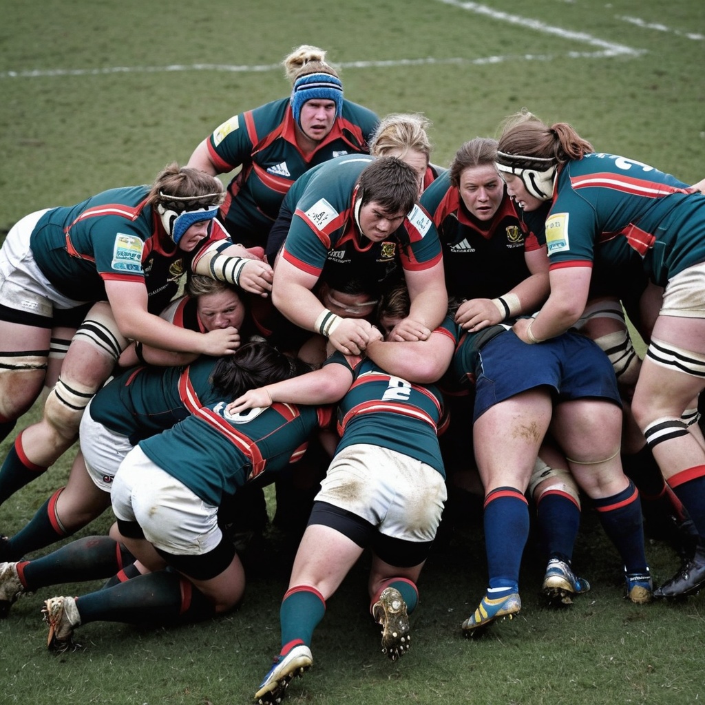 Women rugby players with very large, heavy breasts in a scrum.