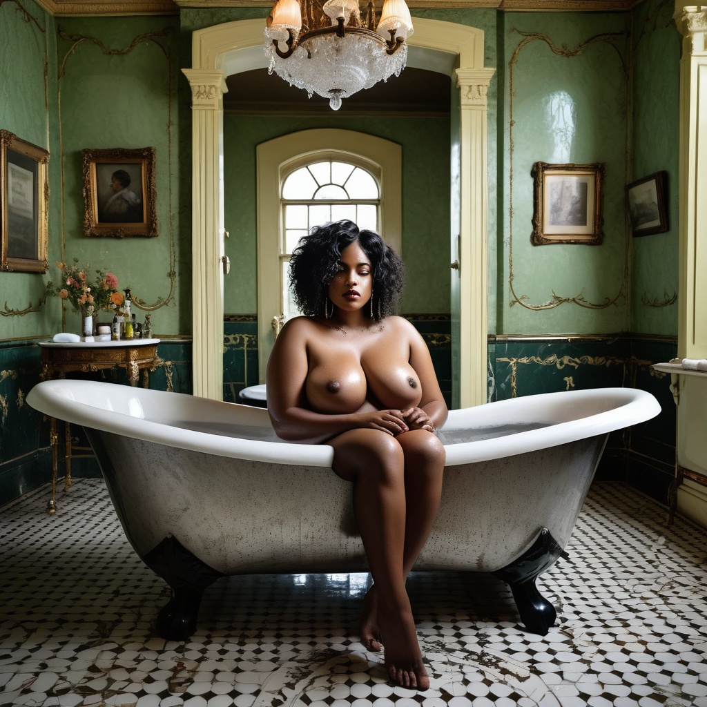A voluptuously-shaped Caribbean woman with caramel skin and curly black hair, delicately resting in a vintage clawfoot bathtub filled with bubbling soapy water. The bathtub is situated in a grand bathroom within an Edwardian mansion. The bathroom boasts soaring ceilings, embellished cornices and intricately designed period wallpaper in subtle shades of gold and green. There's a large, ornately carved vanity mirror and a glistening crystal chandelier hanging above the bathtub, casting soft, warm light around.
