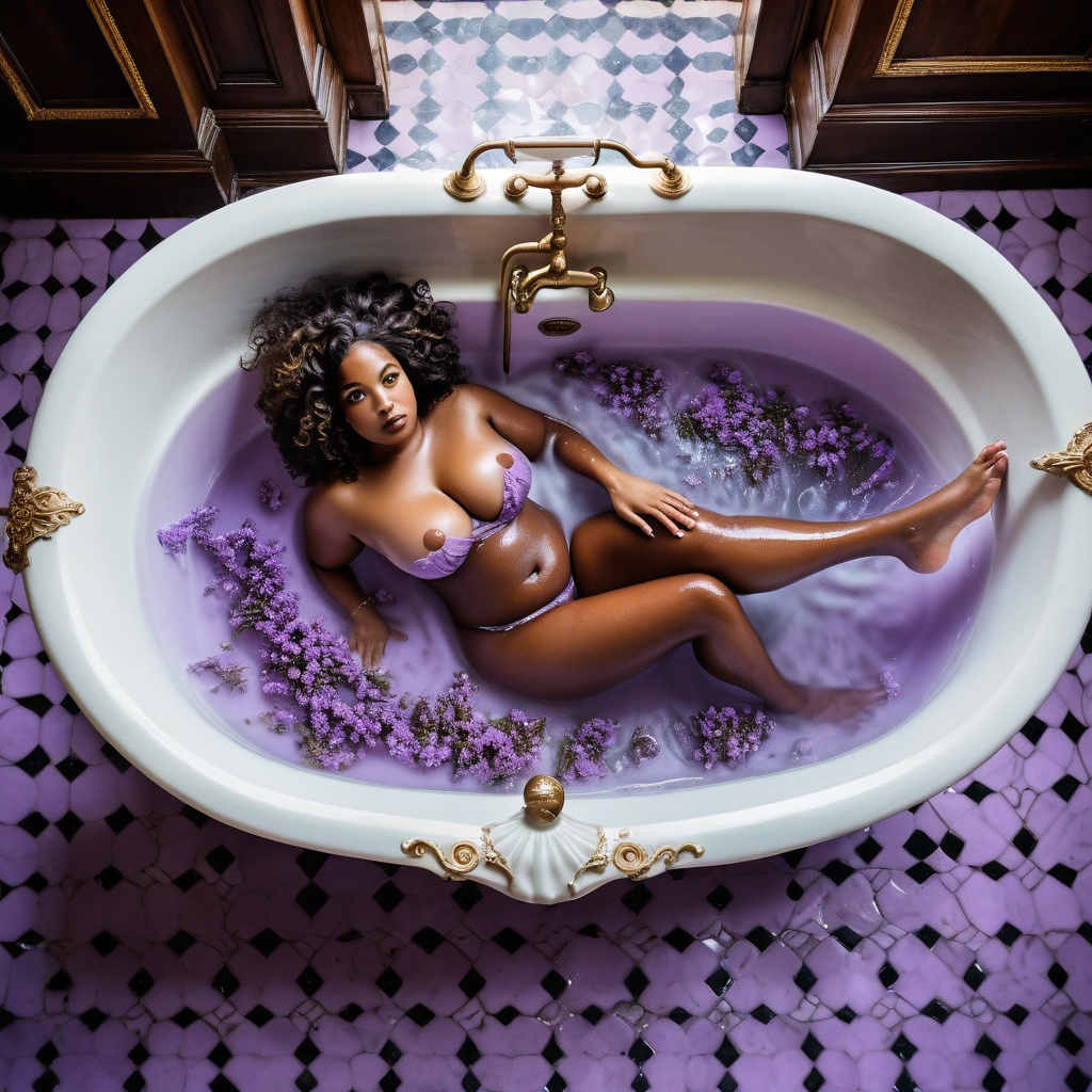 A voluptuous Caribbean woman with dark skin and curly black hair is lying in a clawfoot bathtub filled with bubbles. The bathtub is located in a spacious bathroom of an Edwardian mansion, featuring intricate mosaic floor tiles in hues of white, black and gold. A large, opulent, ornate chandelier hangs from the ceiling, casting a warm, soft glow around the room. The view is from an overhead perspective, allowing the viewer to see the woman's entire body submerged in the bubbles, her