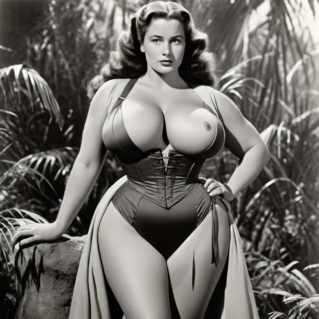 A voluptuously curvaceous Jane from Tarzan, fashioned with an emphasized hourglass figure. She has exceptionally large, heavy, and full bosom. She's wearing an extremely low cut, fitting outfit, similar to a jungle explorer suit, perhaps khaki-colored with short sleeves and Bermuda shorts.