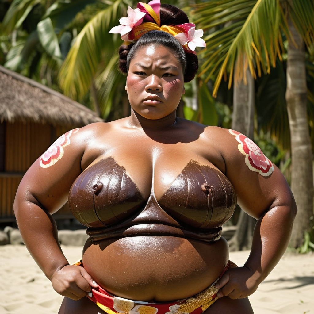 A Caribbean woman working as a sumo wrestler, possessing an impressively large bosom. She boasts tanned skin typical of her region, her hair is jet black and styled in a traditional sumo topknot. She is dressed in a vibrant, colorful mawashi, reflecting her Caribbean roots. Her eyes are dark and determined, her body is muscular, yet carries an ample bosom disproportionate to her body size. Her stance is poised, ready for combat in a traditional sumo ring.