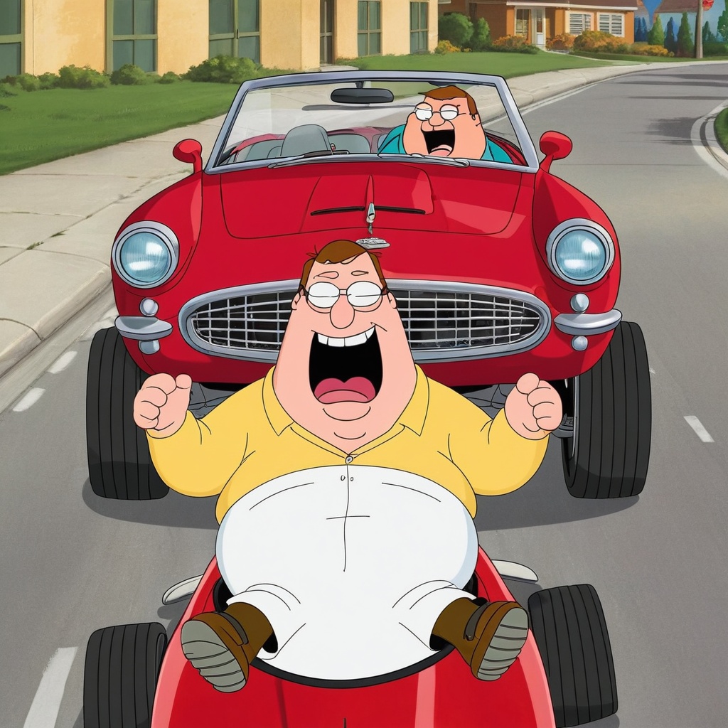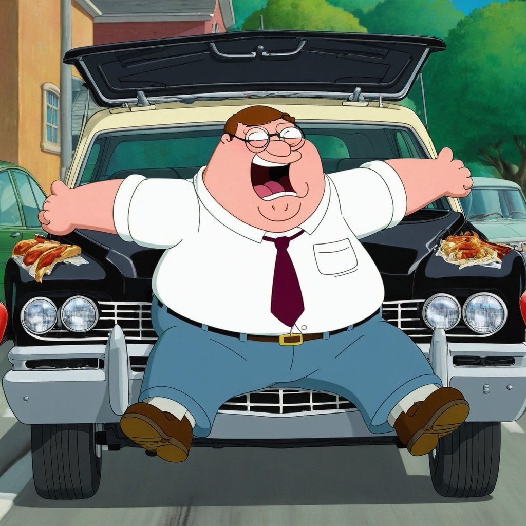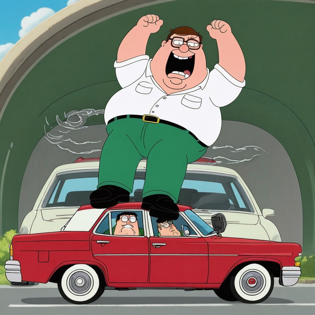 Peter Griffin, a curvaceous man with round glasses and a white shirt, is hanging upside down in a mid-sized red car with his legs bent at the knee and pressed against the roof. He wears a large, flashy grill that glints silver on his teeth, providing a stark contrast against his signature green pants.