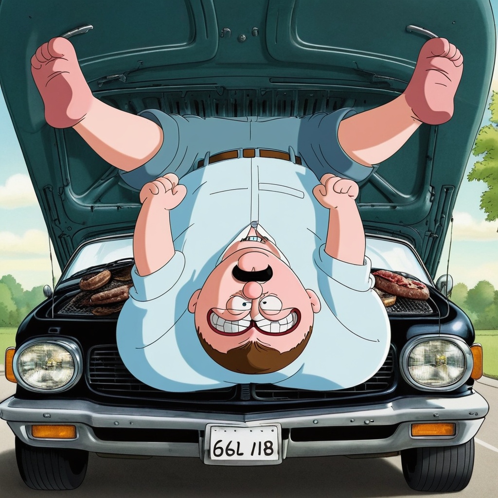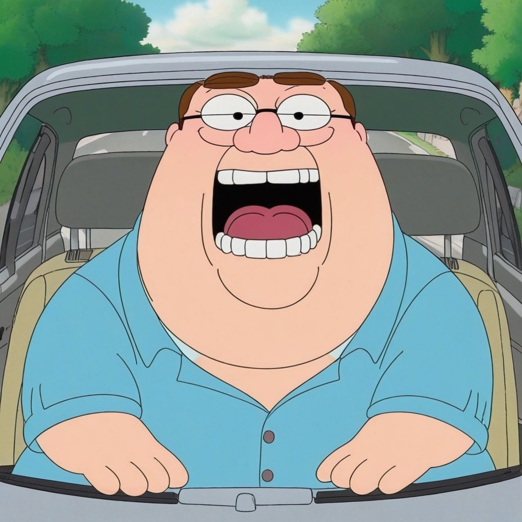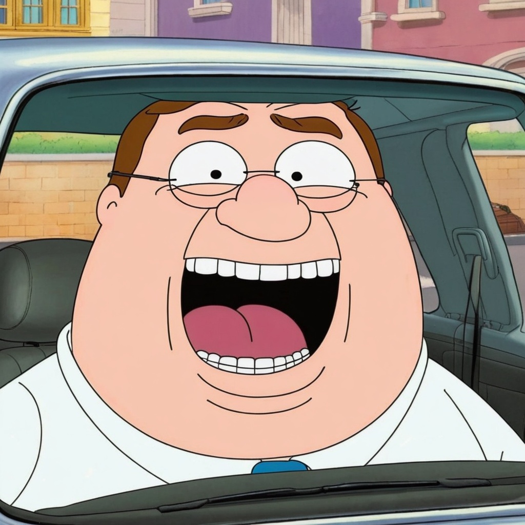 peter griffin is upside down in the car with grills on the teeth?