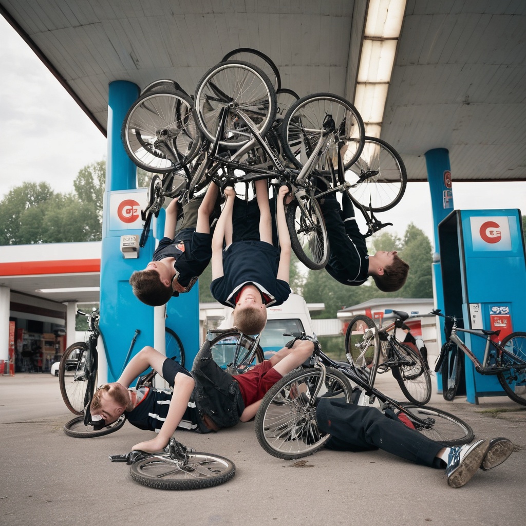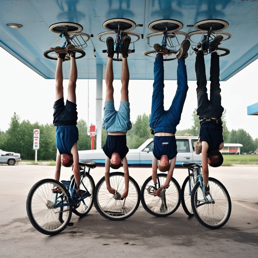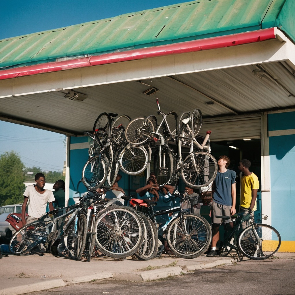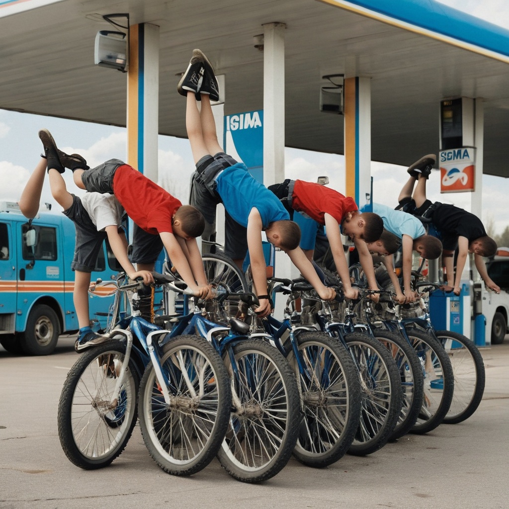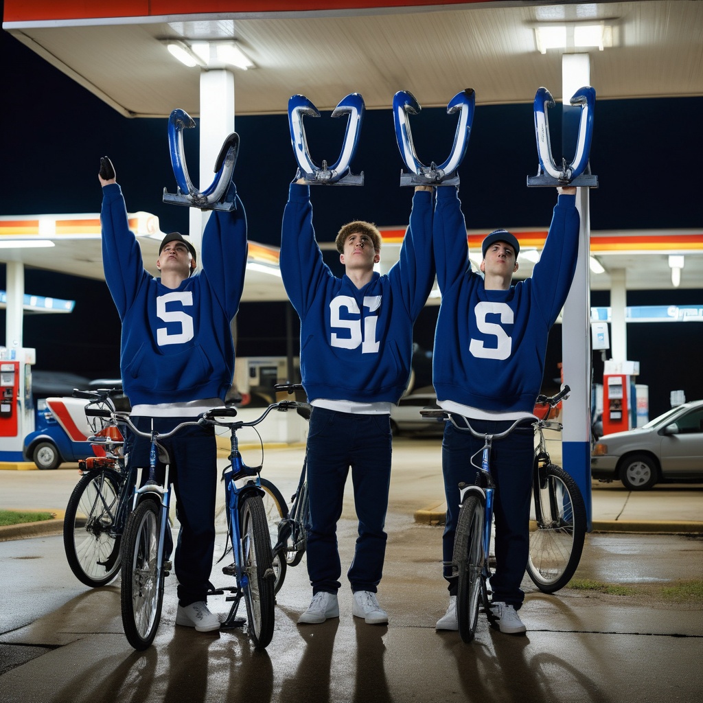 A group of men, casually dressed in jeans and t-shirts, are hanging out at a gas station. The logo on a sign behind them is an upside-down sigma symbol. They lean against their bicycles, parked neatly in a row adjacent to the petrol pumps. The sun is setting, casting long shadows and painting the sky with hues of orange and purple. Fluorescent lights from the gas station bathe the area in their artificial glow.