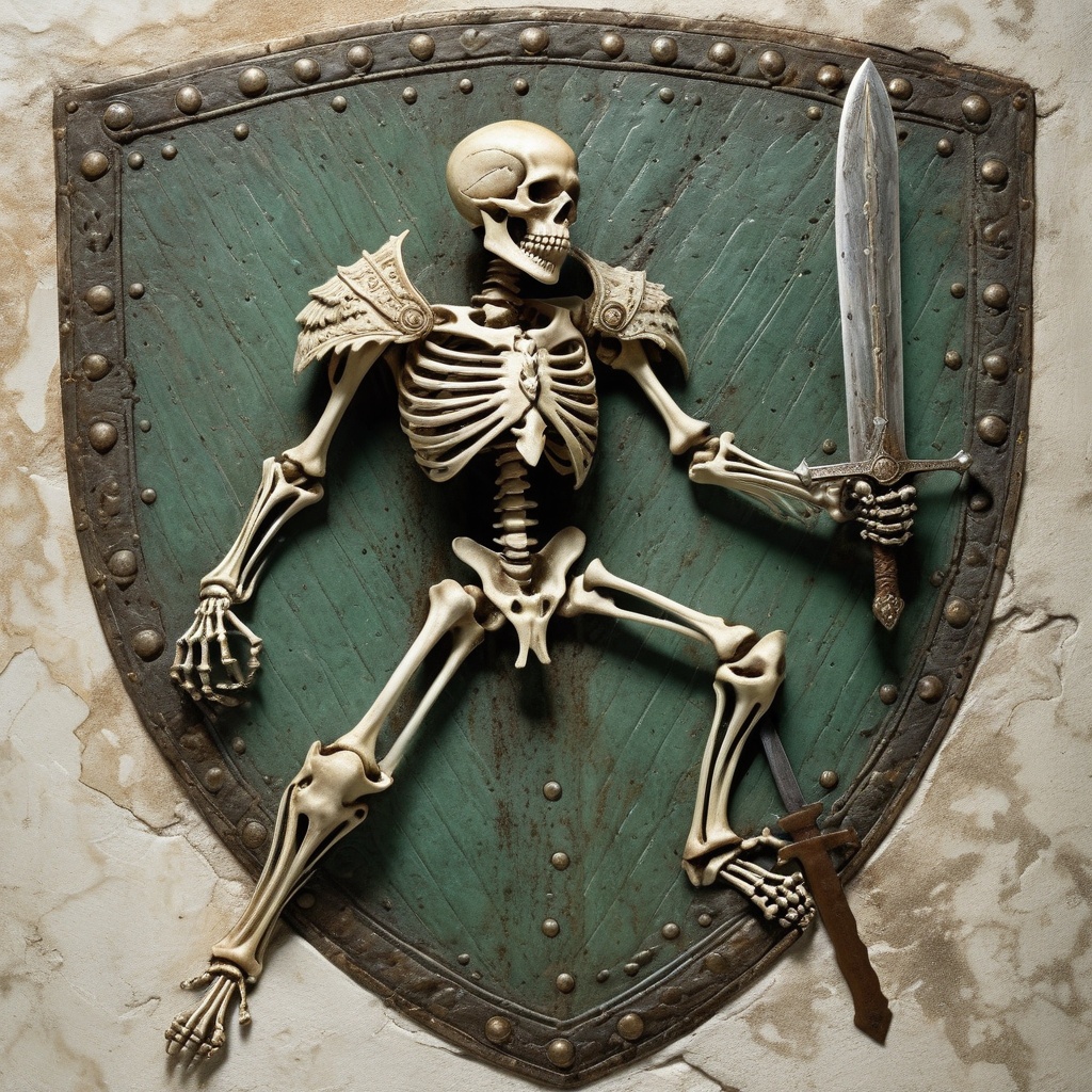 A skeletal figure, with bones glowing a subtle white under dim lighting, energetically striking an aged, rustic iron shield with a sharp, silver-hued, medieval sword. The impact of the sword against the shield causes a flurry of sparks to erupt, illuminating the surrounding space momentarily.