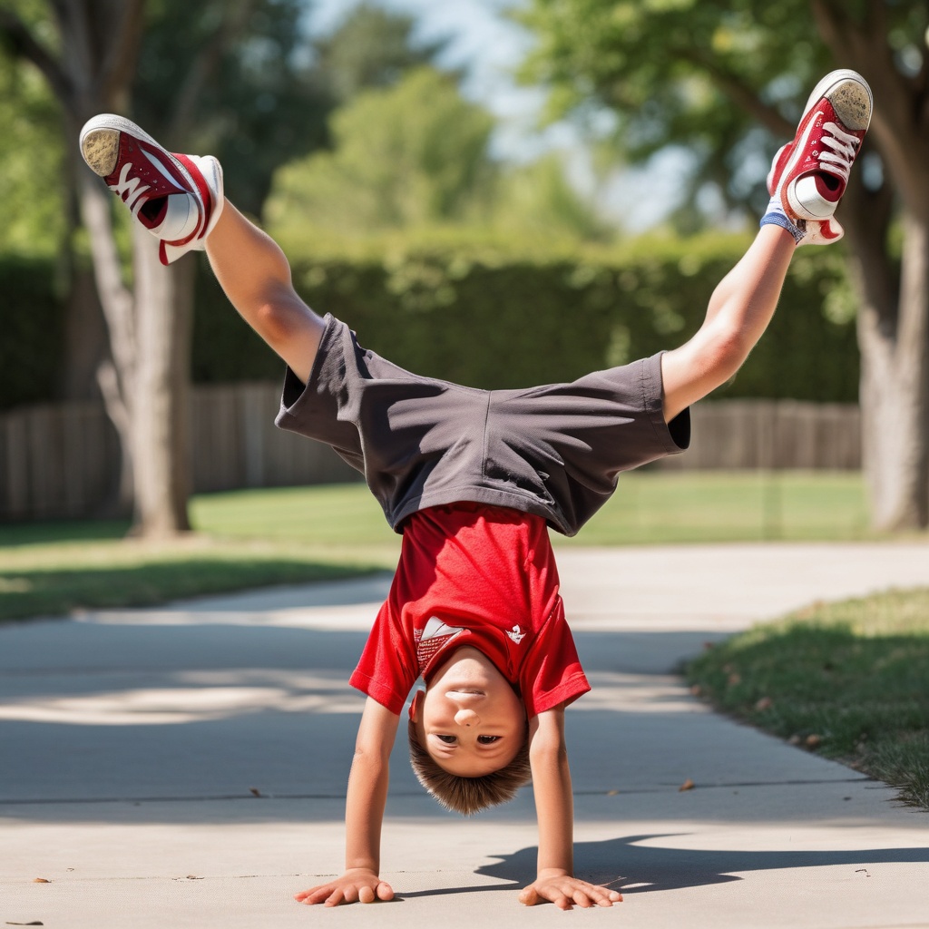 There's a young boy behind you, inverted as he performs cartwheels.